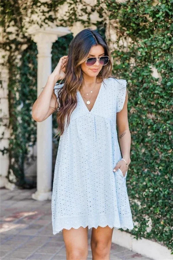 De Brina mouwloze mini-jurk combineert eenvoud met elegantie. Met zijn flatterende pasvorm en lichtgewicht stof biedt hij ultiem comfort en bewegingsvrijheid. Perfect voor warme dagen of een stijlvolle avondlook, deze jurk is een must-have voor een moeiteloze, modieuze uitstraling.