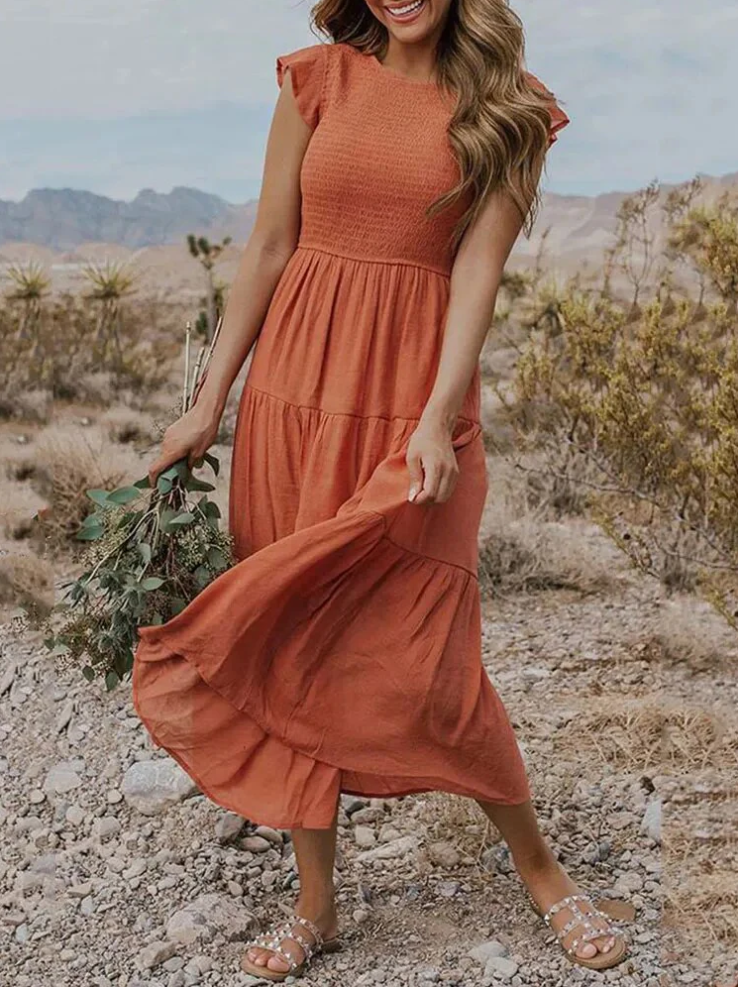Elegante zomerjurk – ruches, zakken: Deze elegante zomerjurk combineert vrouwelijke ruches, praktische zakken en luchtige charme. Perfect voor een zomerse dag waarop je er moeiteloos stijlvol én comfortabel uit wilt zien.