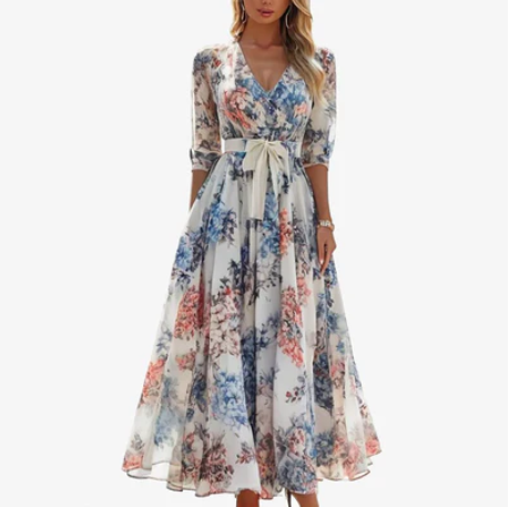 "Elizabeth, gebloemde midi-jurk: Een charmante midi-jurk met een bloemenpatroon dat tijdloze elegantie en vrouwelijke verfijning belichaamt. Ideaal voor diverse gelegenheden en een stijlvolle uitstraling."