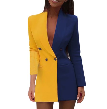 De Emily Color Block tweekleurige blazerjurk met dubbele rij knopen is een moderne en opvallende keuze. Met zijn opvallende kleurblokkenontwerp en klassieke knoopsluiting met dubbele rij knopen zet deze jurk modieuze accenten. Ideaal voor stijlvolle optredens en speciale gelegenheden, de Emily-jurk combineert eigentijdse elegantie met een vleugje extravagantie.