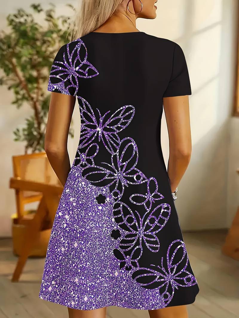 "Isabella jurk met kleurvlakken, V-hals en vlinderprint: Een elegante jurk met kleurvlakken, V-hals en levendige vlinderprint, perfect voor elke gelegenheid ."