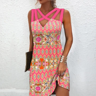 Jasmijn, roze mini-jurk met gemengde print: een levendige roze mini-jurk met een verscheidenheid aan prints die frisheid en modieuze charme combineert. Perfect voor zomerse gelegenheden en een opvallende verschijning.