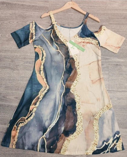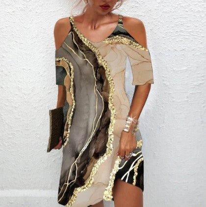 "Layla, goudgrijze off-shoulder mini-jurk met marmeren spatten: Een opvallende goudgrijze mini-jurk met een off shoulder design en marmeren spatten die moderne stijl en elegantie combineert. Ideaal voor speciale gelegenheden en een glamoureuze uitstraling."