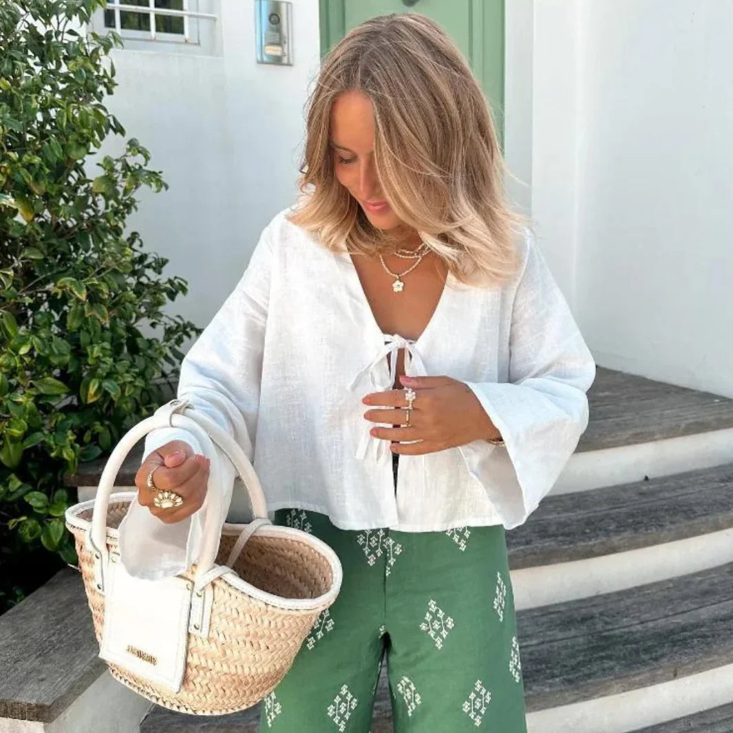 Dit linnen overhemd met veterdetails combineert casual comfort met een vleugje boho-chic. De lichte stof zorgt voor een aangename luchtigheid, terwijl de veters een bijzondere touch aan het ontwerp geven. Ideaal voor ontspannen, stijlvolle looks in de zomer.