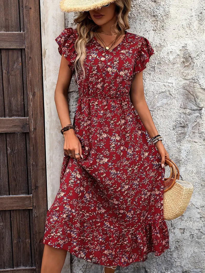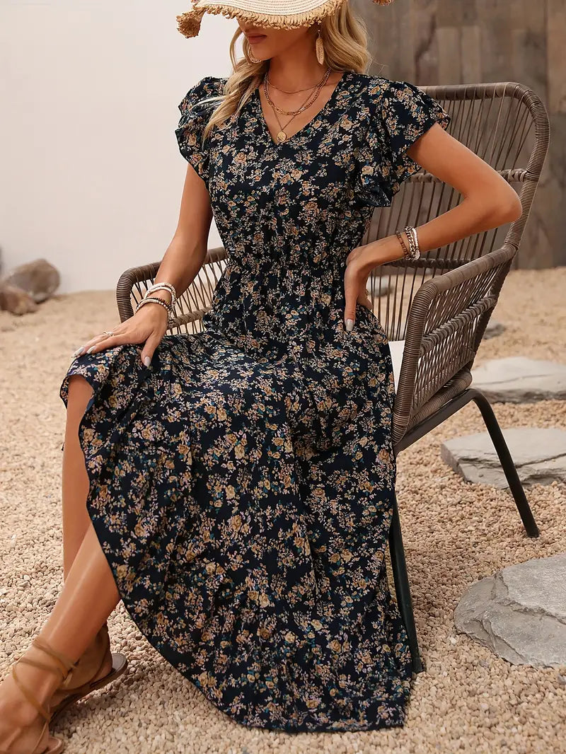 Lily, gebloemde jurk met V-hals en elegante mouwen met ruches: ideaal voor een romantische en stijlvolle uitstraling