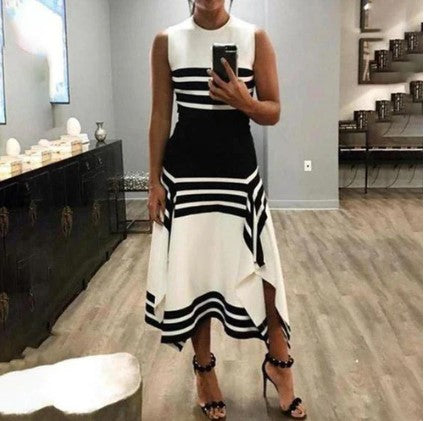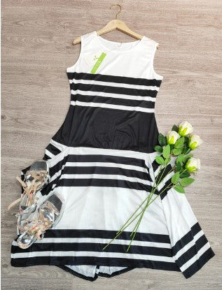 "Lily, gestreepte zwarte abrikozenjurk met blokhals: Een modieuze jurk met zwarte en abrikozenstrepen en een elegante blokhalslijn. Perfect voor stijlvolle gelegenheden en een trendy uitstraling."
