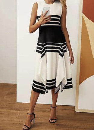 Lily - gestreepte zwarte abrikooskleurige jurk met blokhals