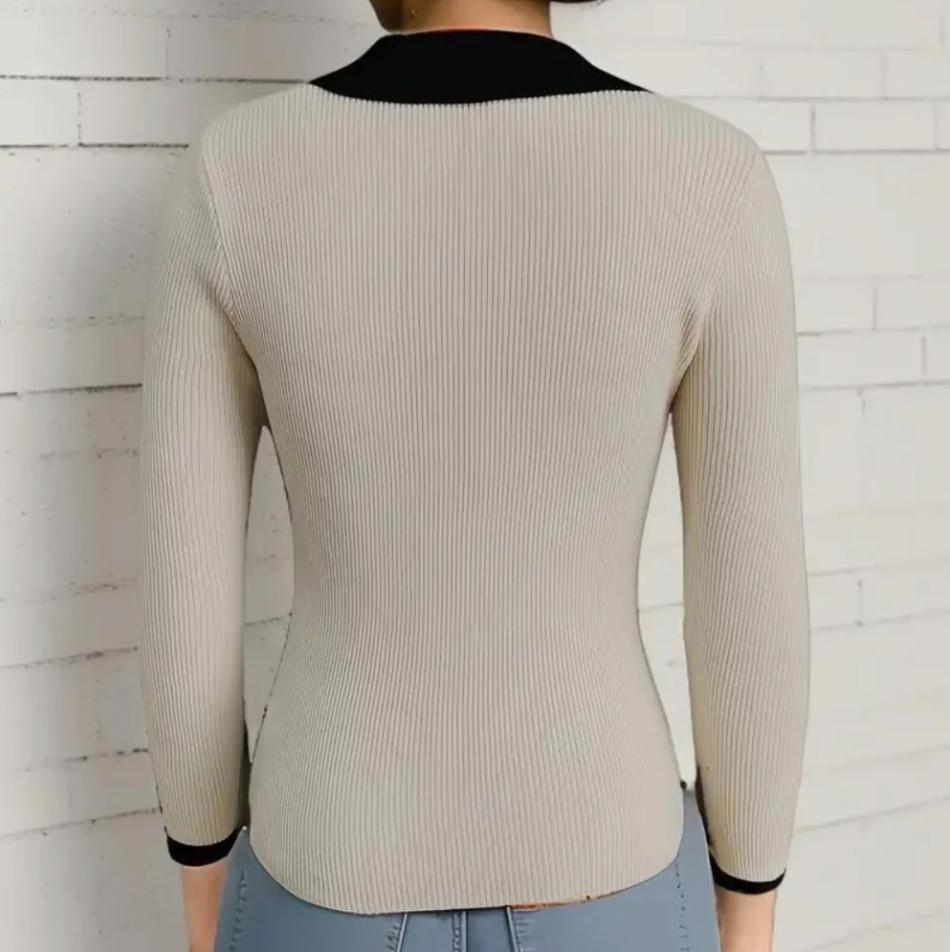 De Maribel damestrui met contrasterende kraag is een stijlvolle keuze voor elke garderobe. Gemaakt van zachte materialen, biedt het comfort en een flattering fit. De contrasterende kraag voegt een speelse touch toe, waardoor het ideaal is voor zowel casual als chic outfits.
