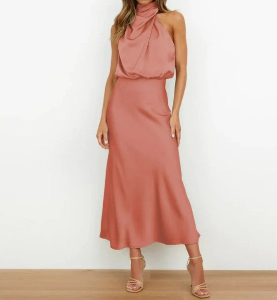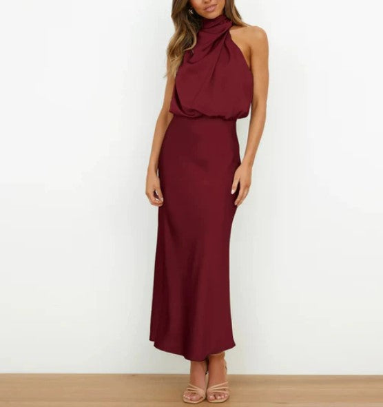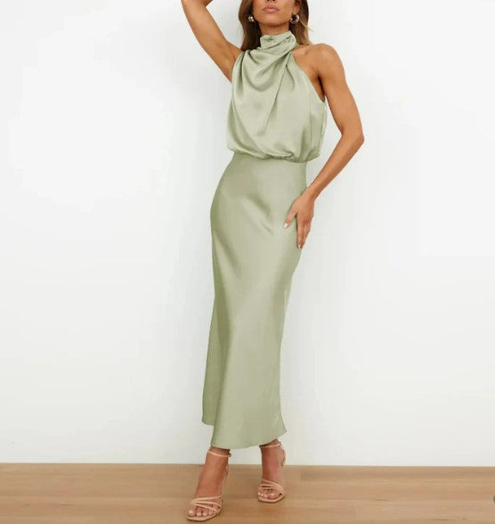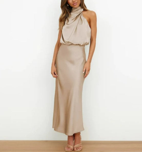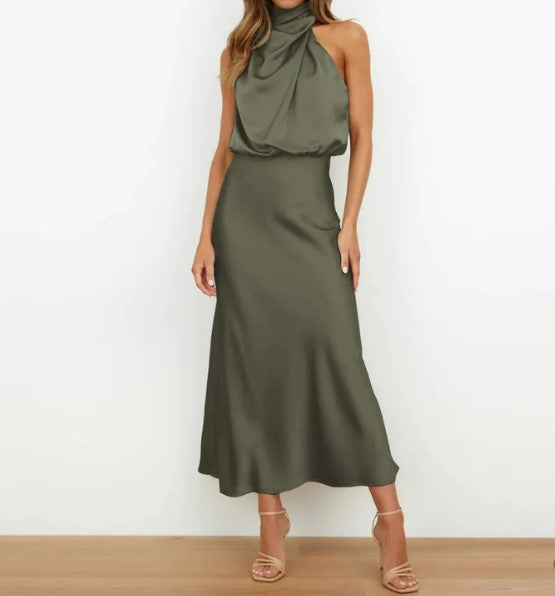 Mia champagnegroen zwart satijnen maxi-jurk met halternek