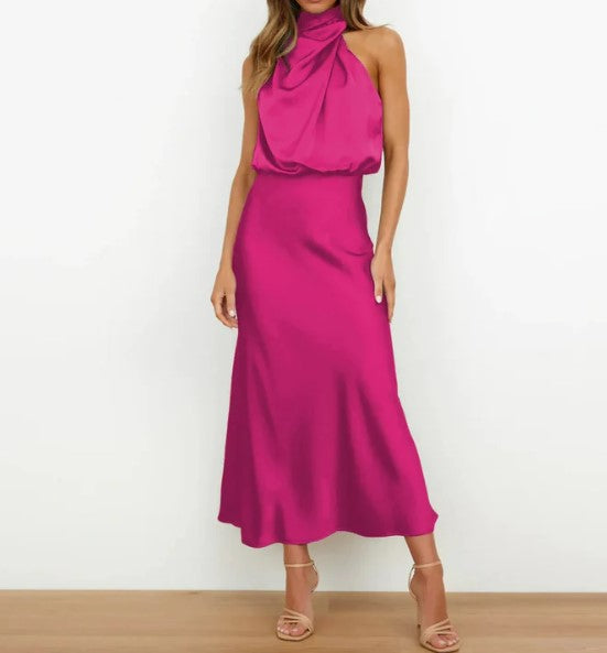 Maak kennis met Mia, een satijnen halter maxi-jurk in champagnegroen en zwart. Deze elegante jurk combineert verfijning met moderne stijl en is perfect voor elke speciale gelegenheid.