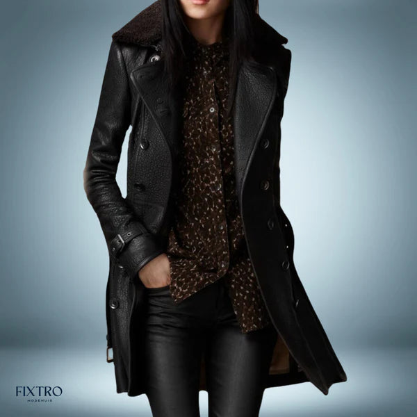 Moderne lange leren jas combineert eigentijdse stijl met luxe, perfect voor een verfijnde look.