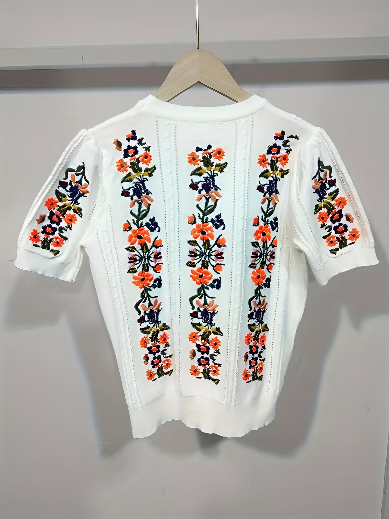 Nadette is een frisse bloementop met korte mouwen, perfect voor een luchtige en vrolijke uitstraling. Ideaal voor een zomerse en stijlvolle look.