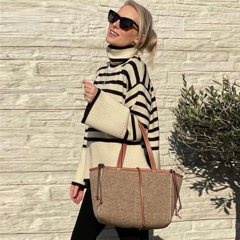 De Natalie gestreepte coltrui is een stijlvolle en veelzijdige keuze voor koelere dagen. Met haar modieuze strepen en comfortabele col biedt deze trui zowel warmte als een trendy uitstraling. Perfect om casual of chic te dragen, voegt de Natalie coltrui een speelse en eigentijdse touch toe aan elke outfit.