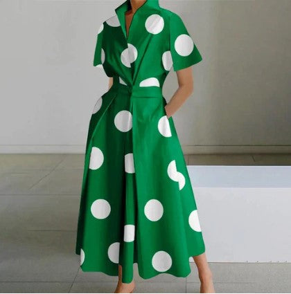 Natalie – groene maxi-jurk met stippen en korte mouwen