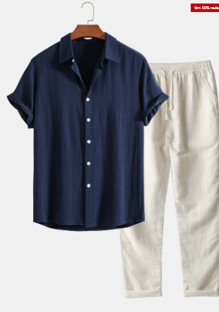 Nia, linnen overhemd en broek: een casual en lichte outfit van linnen, ideaal voor ontspannen dagen en zomerse frisheid.