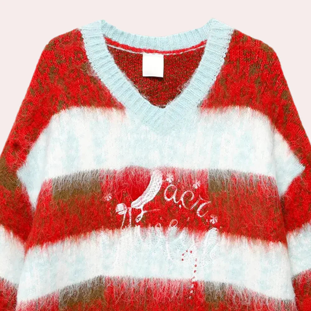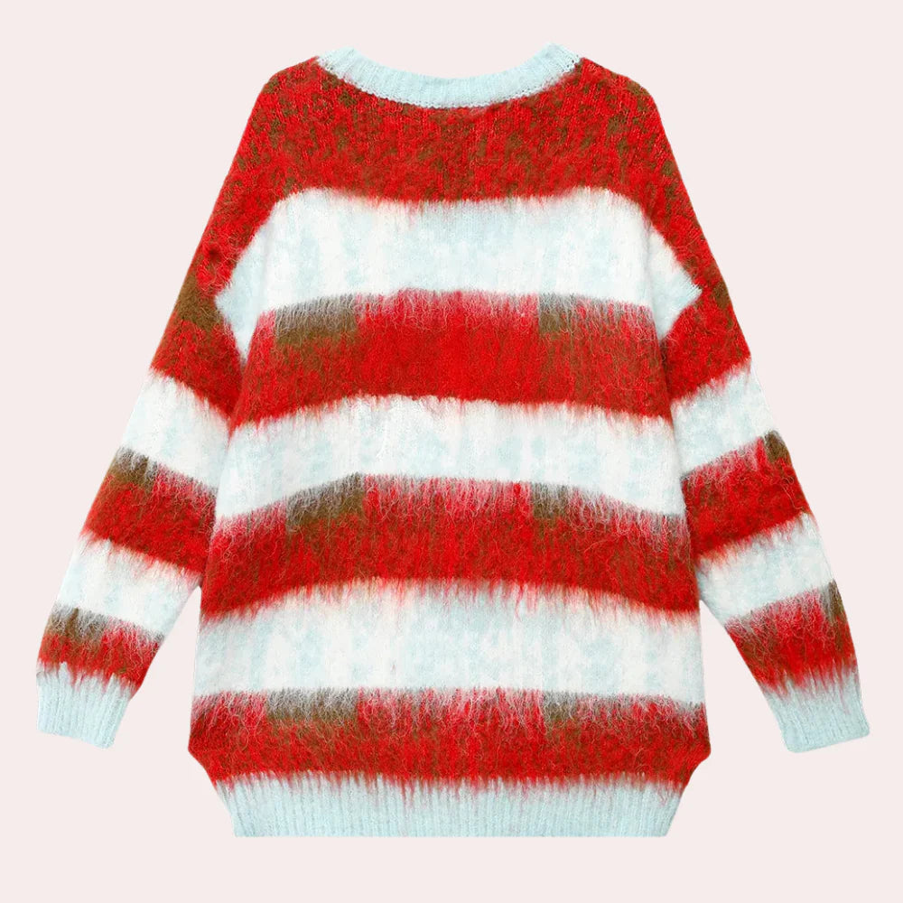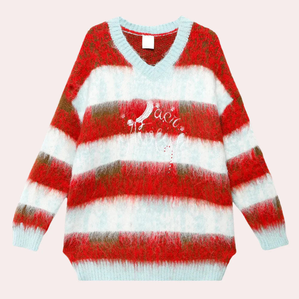 NIANA - gestreepte comfortabele kersttrui voor dames combineert feestelijke charme met dagelijks comfort. Gemaakt van zachte materialen en voorzien van een vrolijk gestreept ontwerp, perfect voor een gezellige en stijlvolle look tijdens de feestdagen.