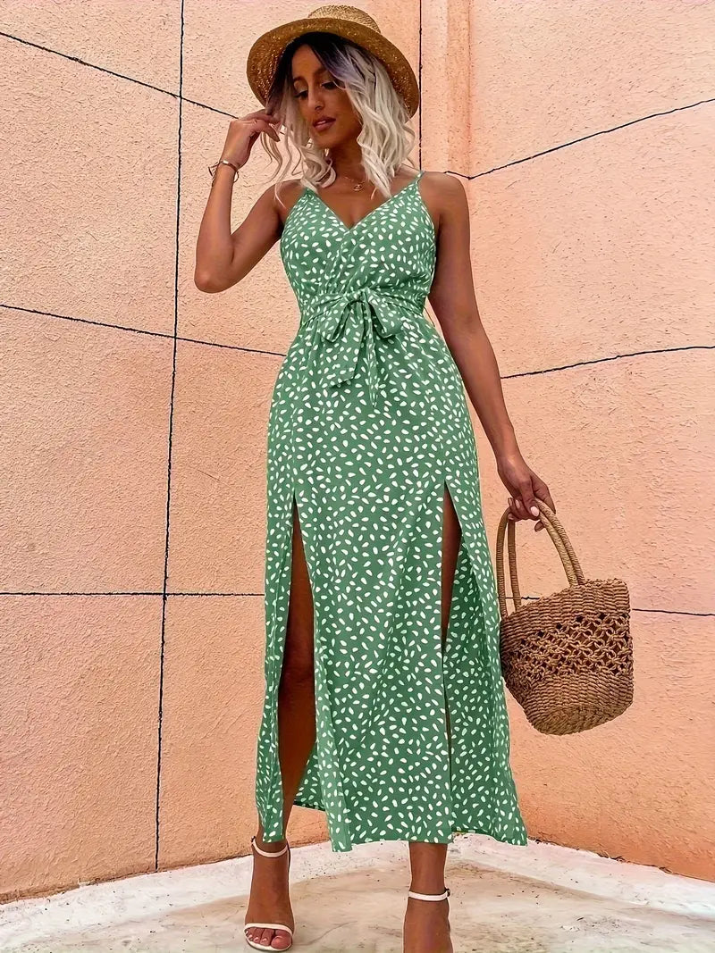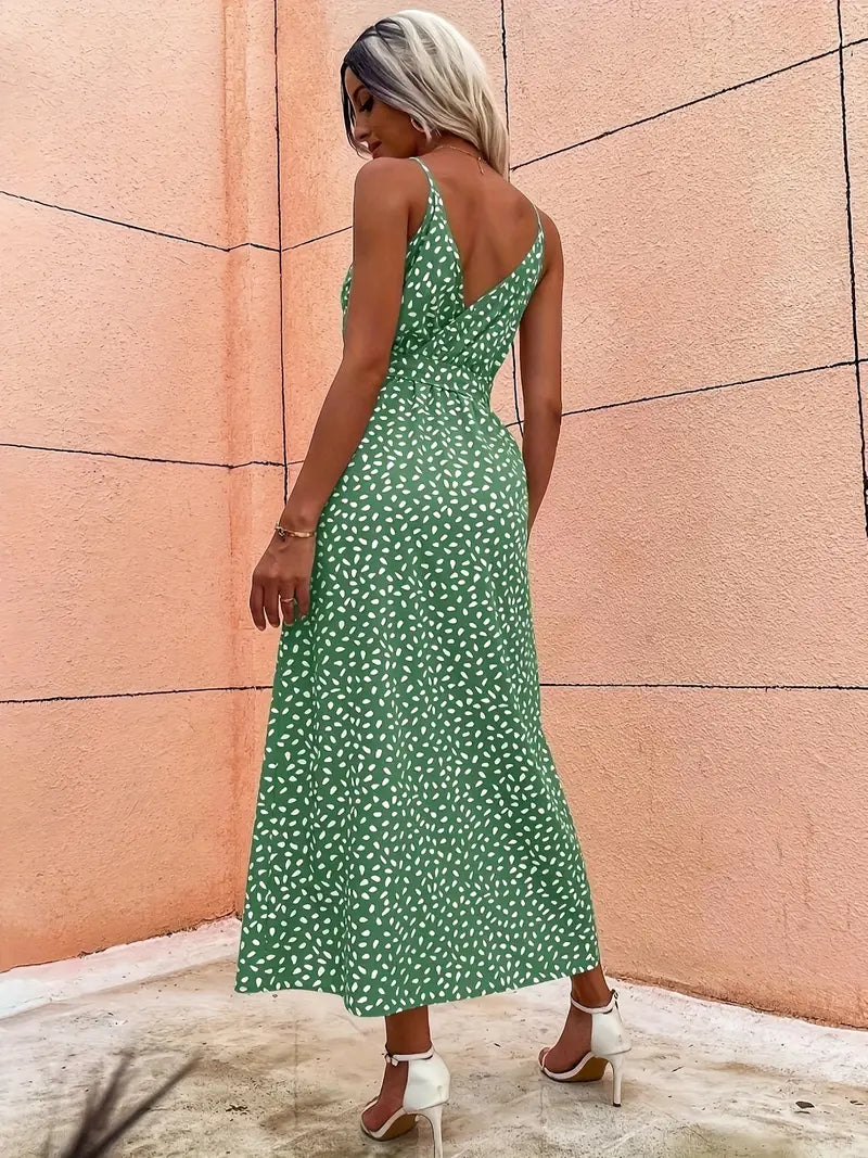 Primrose cami-jurk met V-hals en all-over print: Een stijlvolle jurk met dunne bandjes, een diepe V-hals en een all-over patroon, ideaal voor warme dagen en speciale gelegenheden.