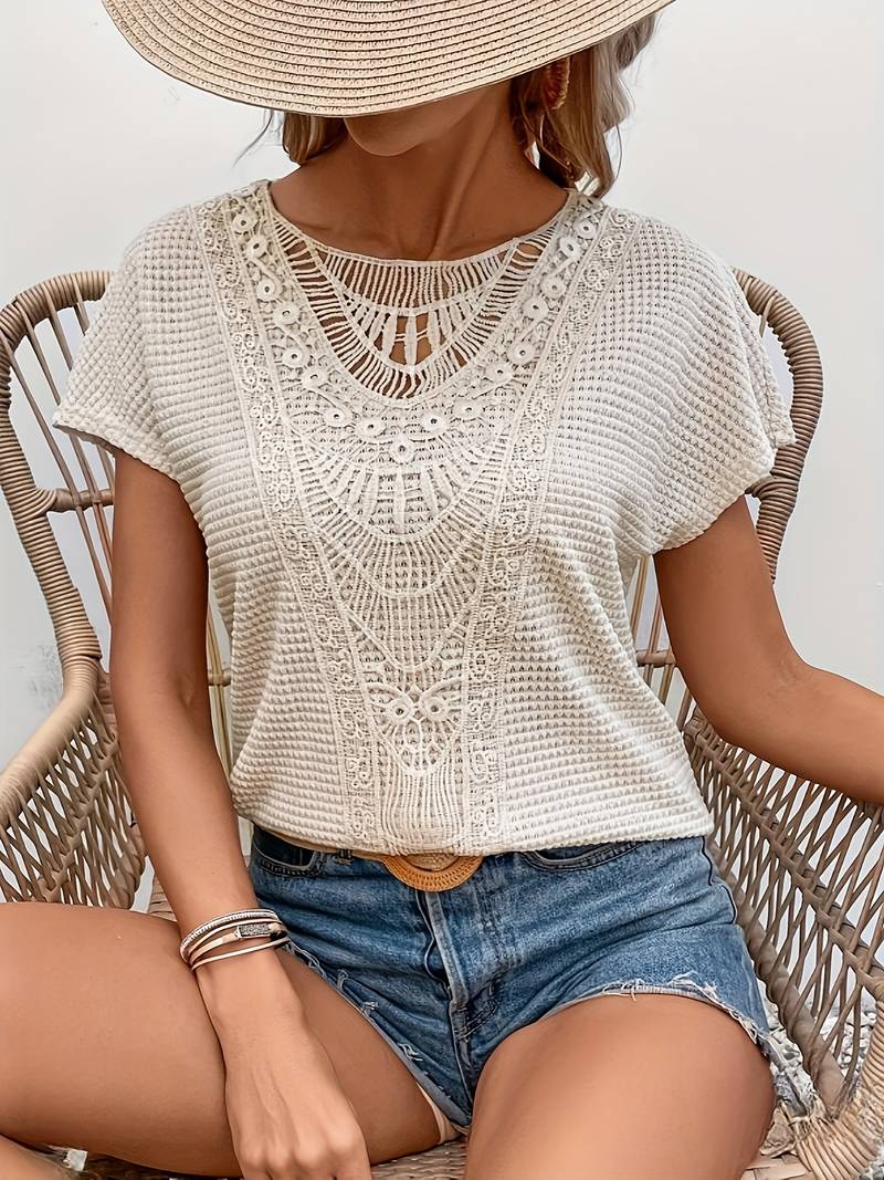 Maak kennis met Seraphina's elegante kanten T-shirt, een veelzijdige toevoeging aan elke garderobe. Dit tijdloze exemplaar is gemaakt van delicate kant en heeft een klassieke ronde halslijn. Het voegt een vleugje verfijning toe aan elk ensemble. Het kanten T-shirt van Seraphina is perfect voor zowel casual als geklede gelegenheden en biedt moeiteloze stijl en comfort.