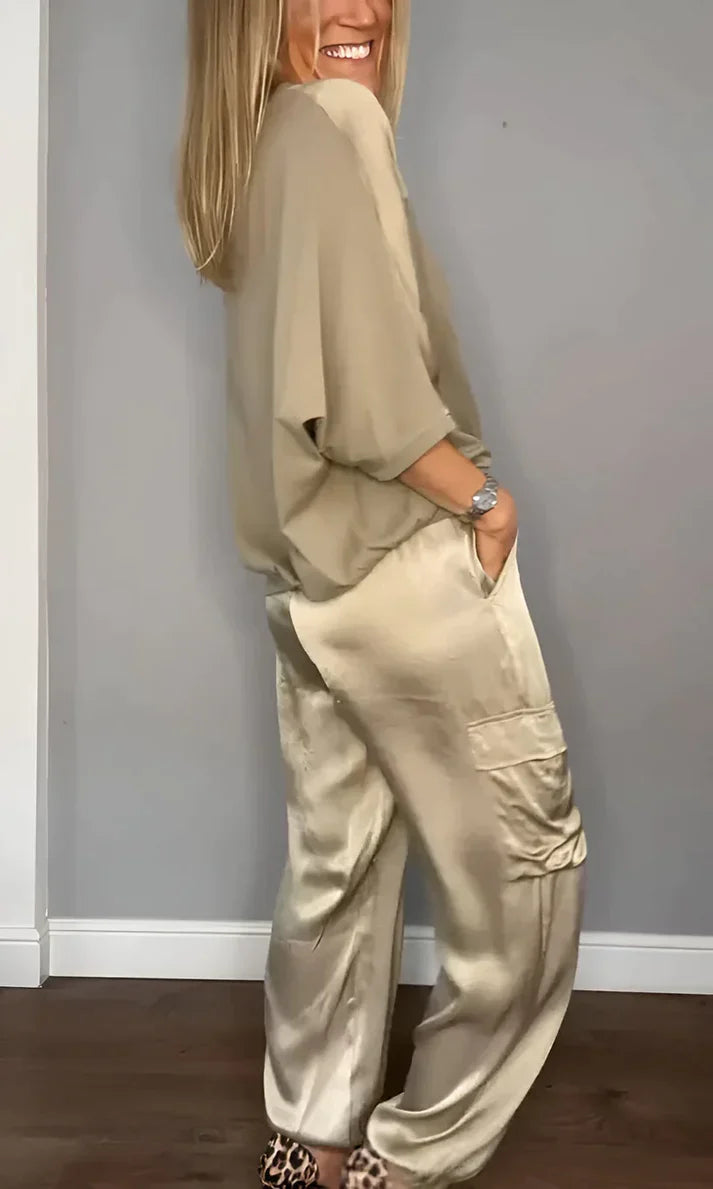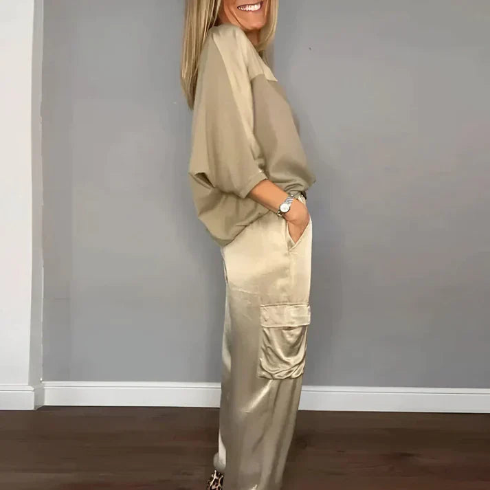 Het tweedelige pak "Silkease" biedt een elegante stijl en een hoog draagcomfort. Bestaande uit een top en een broek, ideaal voor diverse gelegenheden. Het is gemaakt van hoogwaardige materialen en combineert een chique design met een comfortabele pasvorm voor modebewuste vrouwen.