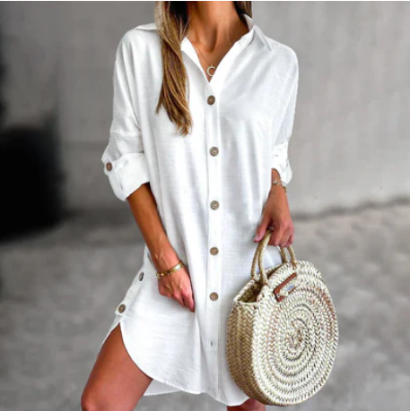 "Sofia, strandparel linnen overhemdjurk: Een elegante overhemdjurk van licht linnen die indruk maakt door zijn strandparelcharme. Perfect voor zomerdagen en ontspannen elegantie."