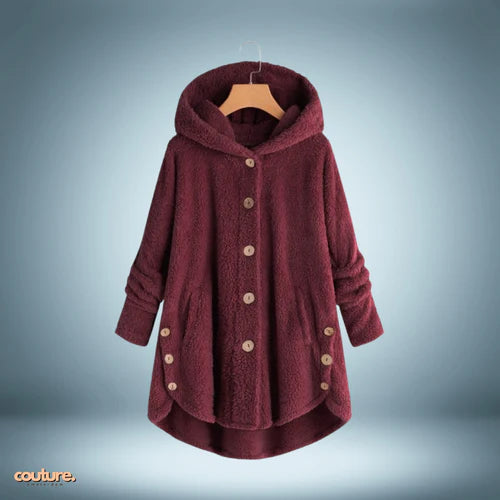 Teddyjack met knopen en capuchon biedt knusse warmte en een trendy uitstraling, perfect voor koude dagen.