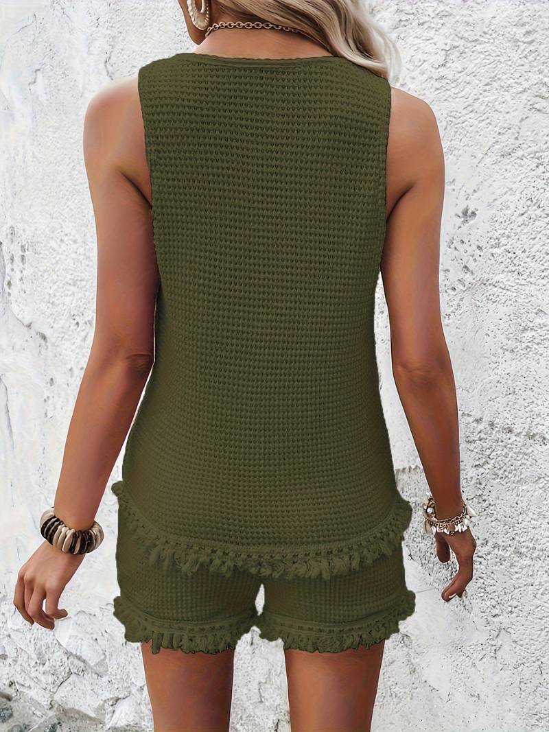 Victoria – elegante effen kleur mouwloze truitop en kanten shorts set