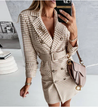 Zoe - geruite blazerjurk met dubbele rij knopen en riem